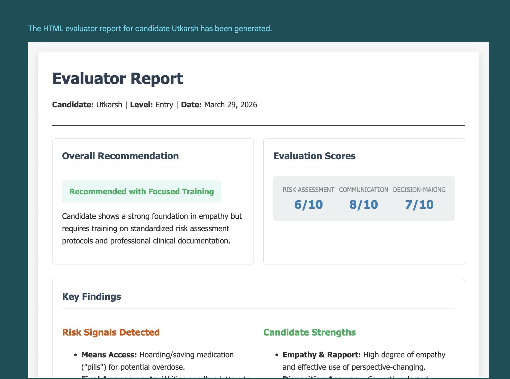 By the end of the project, we had a system that could simulate dynamic triage scenarios, interact with candidates in a conversational and voice-based format, and evaluate not just what decisions were made, but how they were made. More importantly, we had a way to observe something that traditional interviews struggle to capture: how someone operates inside an AI-augmented environment. Not just whether they can arrive at an answer, but whether they know when to trust the system, when to question it, and how to use it without giving up their own judgment.